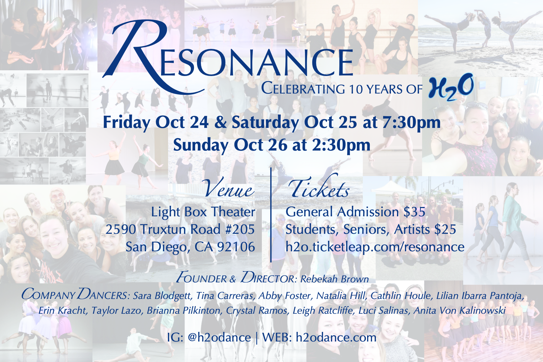 Performing with H2O for this special celebration are company dancers Sara Blodgett, Tina Carreras, Abby Foster, Natalia Hill, Cathlin Houle, Lilian Ibarra Pantoja, Erin Kracht, Taylor Lazo, Brianna Pilkinton, Crystal Ramos, Leigh Ratcliffe, Luci Salinas, and Anita Von Kalinowski. Some have been with H2O for many years, and for others this marks their first performance; each dancer brings light, life, and a unique voice to the works on this program.